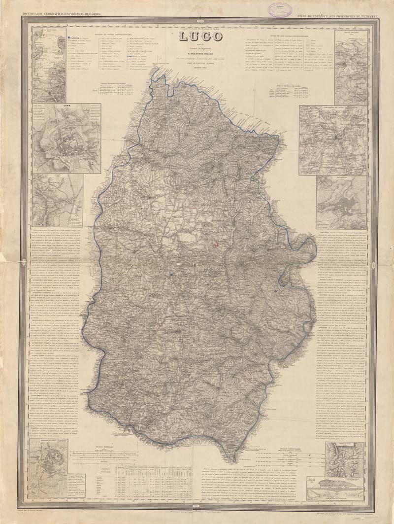 Comprende la provincia de Lugo y sus alrededores. Inserta los siguientes mapas y planos: 1. Ría de Vivero. – 1:50.000. – 16 x 7 cm. 2. Lugo. – 1:10.000. – 15 x 14 cm. 3. Sárria. – 1:10.000. – 11 x 10 cm. 4. Monforte de Lémus. – 1:10.000. – 12 x 8 cm. 5. Ría de Rivadéo. – 1:50.000. – 16 x 7 cm. 6. Contornos de Lugo. – 1:100.000. – 8 x 8 cm. 7. Mondoñedo. – 1:10.000. – 12 x 11 cm. 8. Monte-Furado. – 1:100.000. – 8 x 8 cm. 9. Perfil del Monte-Furado por el eje del túnel. Planta del Túnel de Monte-Furado. – 1:5.000. – 5 x 12 cm.